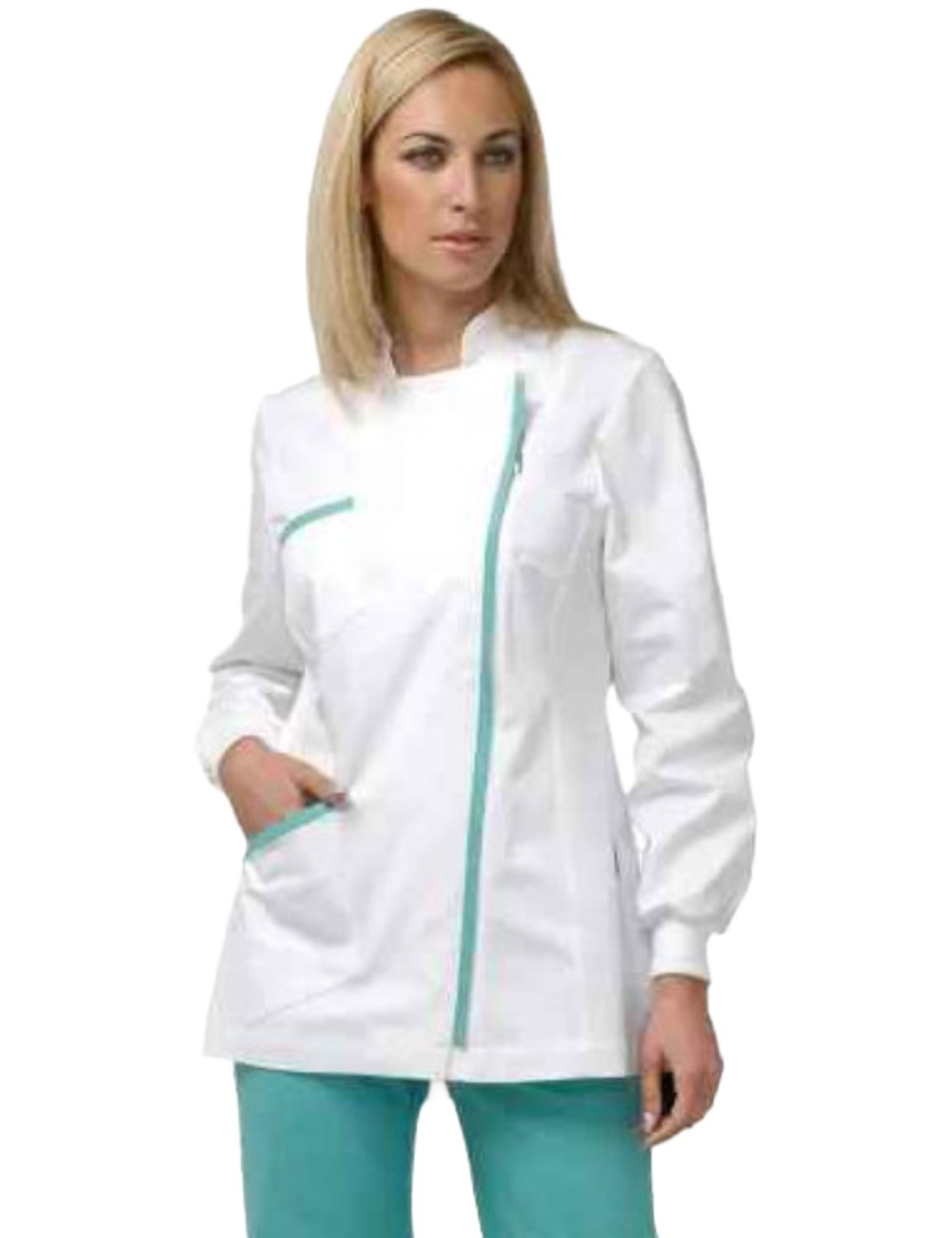 Product Description - Material: The Women's Doctor's Work Smock is made of 100% gabardine cotton, characterized by its durability and ease of cleaning. - Fit and Aesthetics: It has a slim fit with a very elegant and eye-catching white color. Moreover, it has a contrasting green trim that adds an interesting touch to the smock. - Design Features: The Women's Doctor's Work Smock is equipped with long sleeves and soft stretch ribbed cuffs, offering maximum comfort at work. - Accessories and Functions: On the front side, there are practical open pockets for storing tools and materials necessary for work. The closure is guaranteed by a side zip that provides unparalleled convenience of use. - Maintenance: The garment is easily washable in the machine at 60° and can be ironed at medium temperature, making maintenance very convenient.