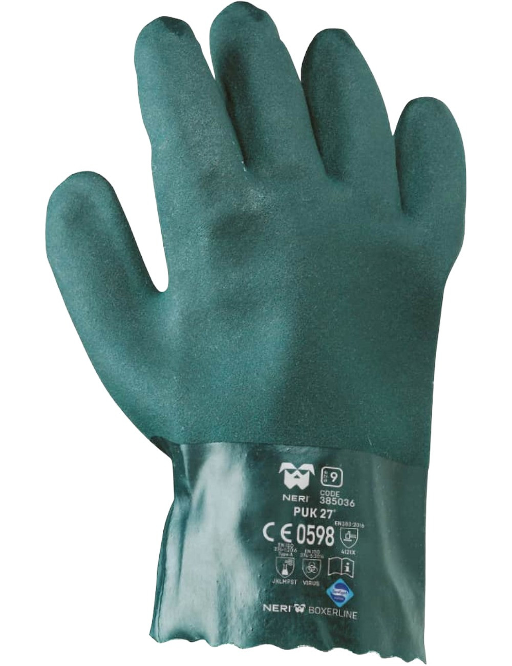 - Funcionalidades: El guante de PVC, recubierto sobre un soporte interno de algodón interlock, proporciona una buena adaptabilidad a la mano y una excelente seguridad química y mecánica.
