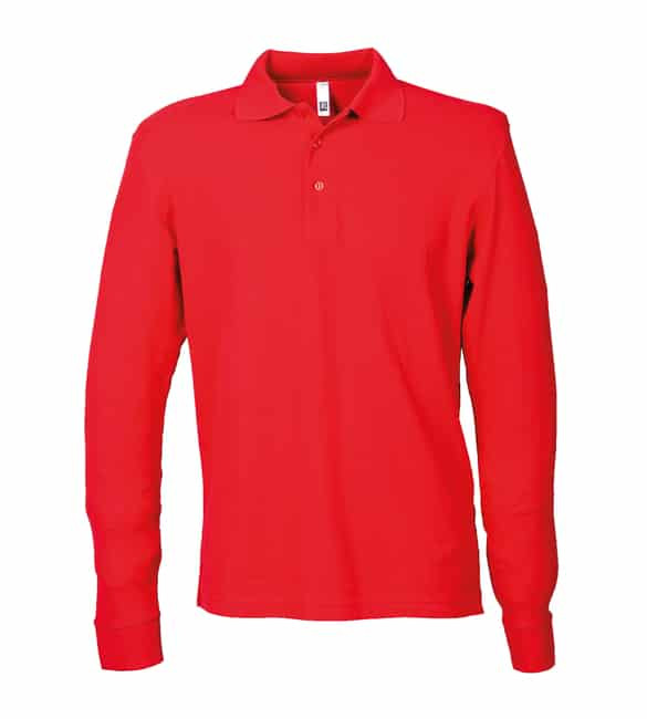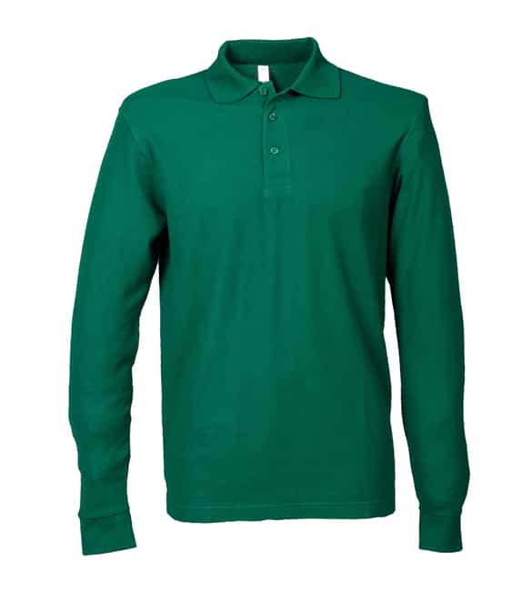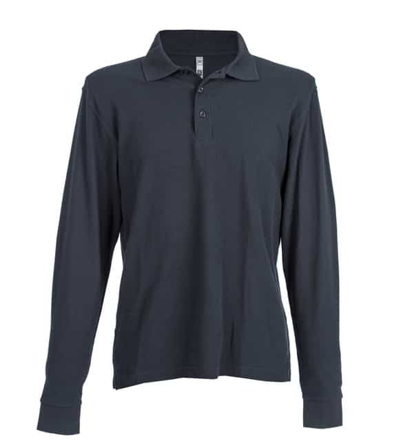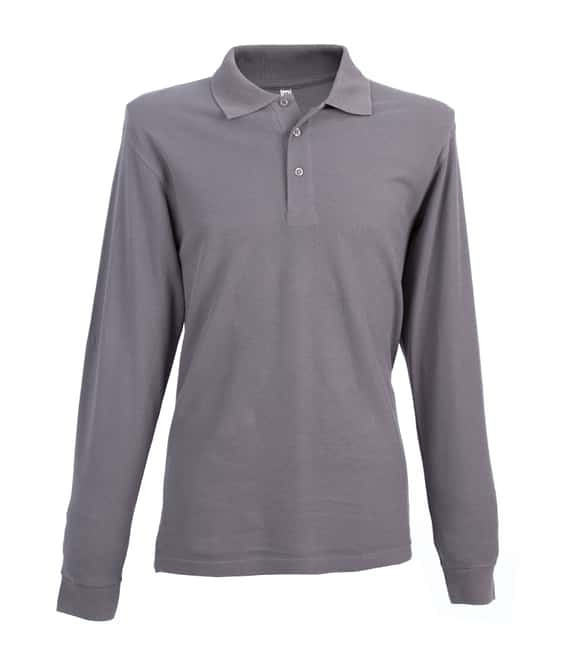 Polo de manga larga - 100% algodón piqué peinado - Tres botones a juego - Cuello y puños en canalé - Aberturas laterales - Embolsados individualmente - Cinta de refuerzo en el cuello N.B. Se recomienda lavar antes de usar para mantener el color inalterado