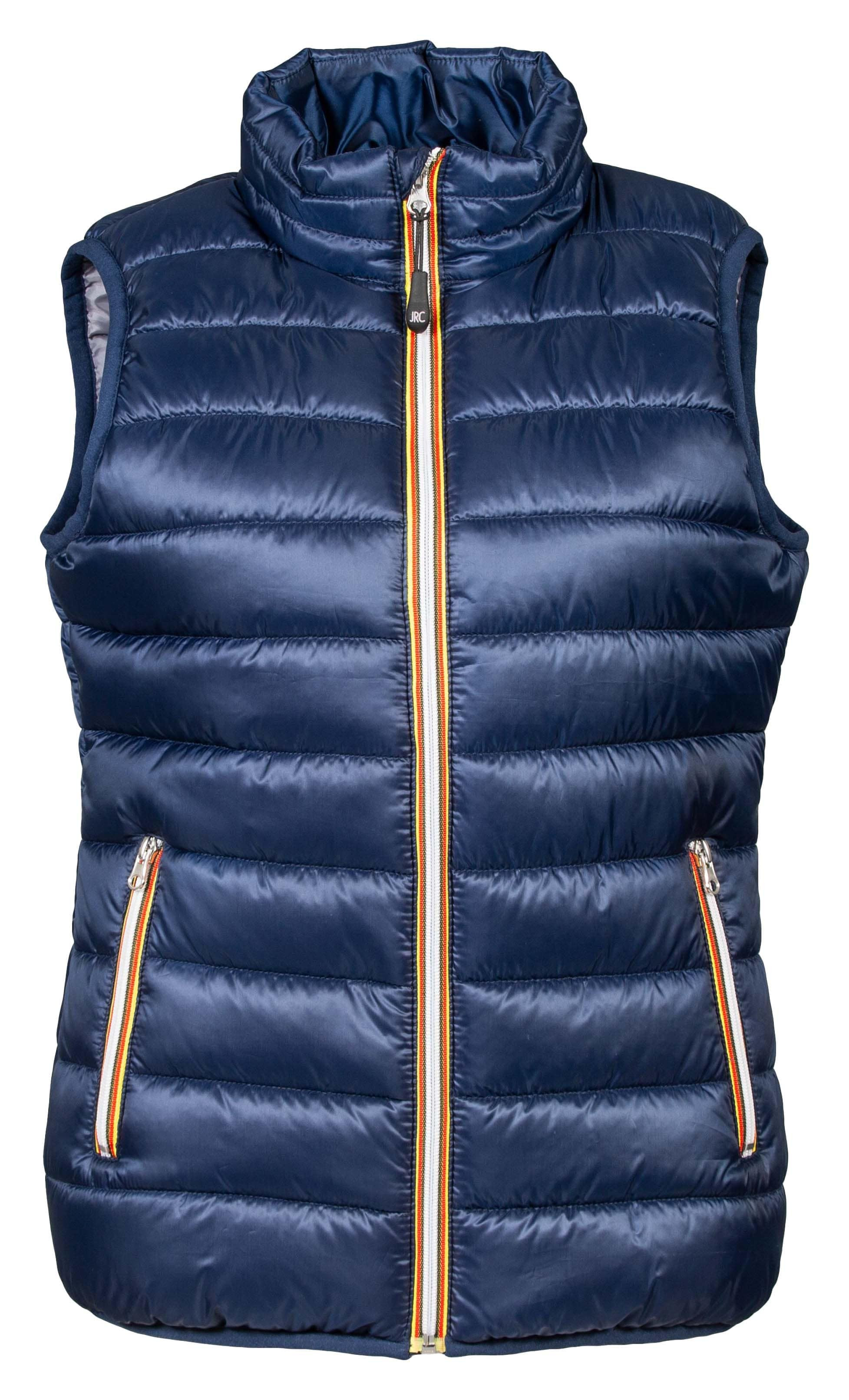 Gilet en nylon doux et brillant - Doublure douce en polyester 300T - Rembourrage en polyester doux (effet plume) - Fermeture à glissière jaune/rouge/noire - Deux poches zippées - Poche interne pour portefeuille - Tissu élastique dans les emmanchures et à la base