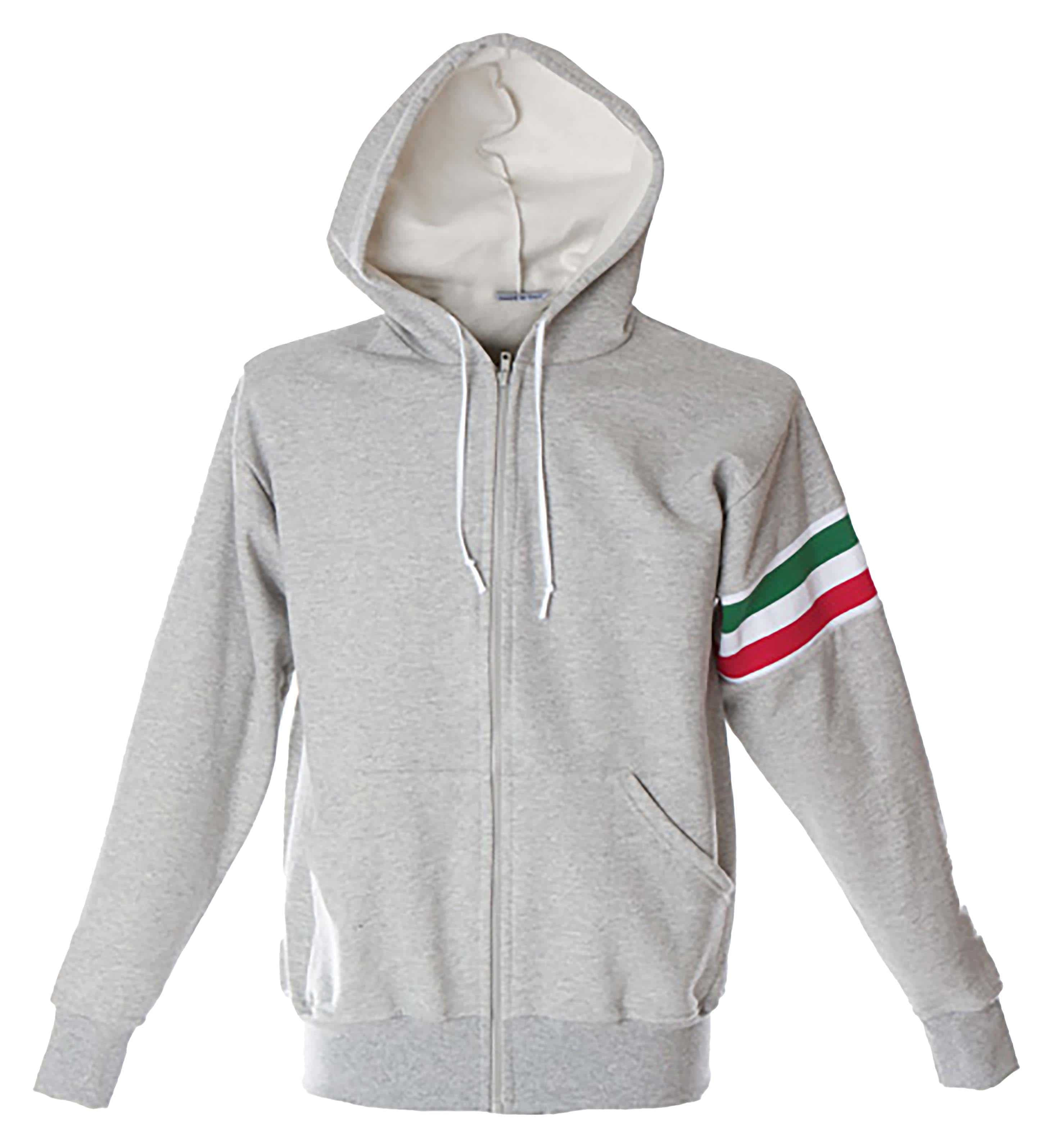 Felpa made in Italy 100% cotone - Cappuccio con cordini bianchi - Zip lunga - Fascia tricolore sul braccio - Tasche a marsupio - Polsini e fondo maglia in costina h cm 8 - Cuciture ribattute