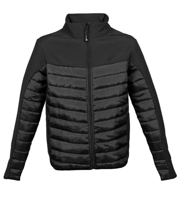 Giubbino in tessuto composito - Corpo e parte inferiore manica in 100% poliestere 300 T cire, con imbottitura in soffice poliestere (effetto piuma) - Spalle, fianchi e parte superiore del busto e della manica in softshell a 2 strati, con interno in pile antipilling - Zip nastrate YKK - Due tasche esterne con zip - Nastro di rinforzo interno collo e tessuto appendiabito - Tessuto elastico ai polsi - Tessuto elastico al fondo