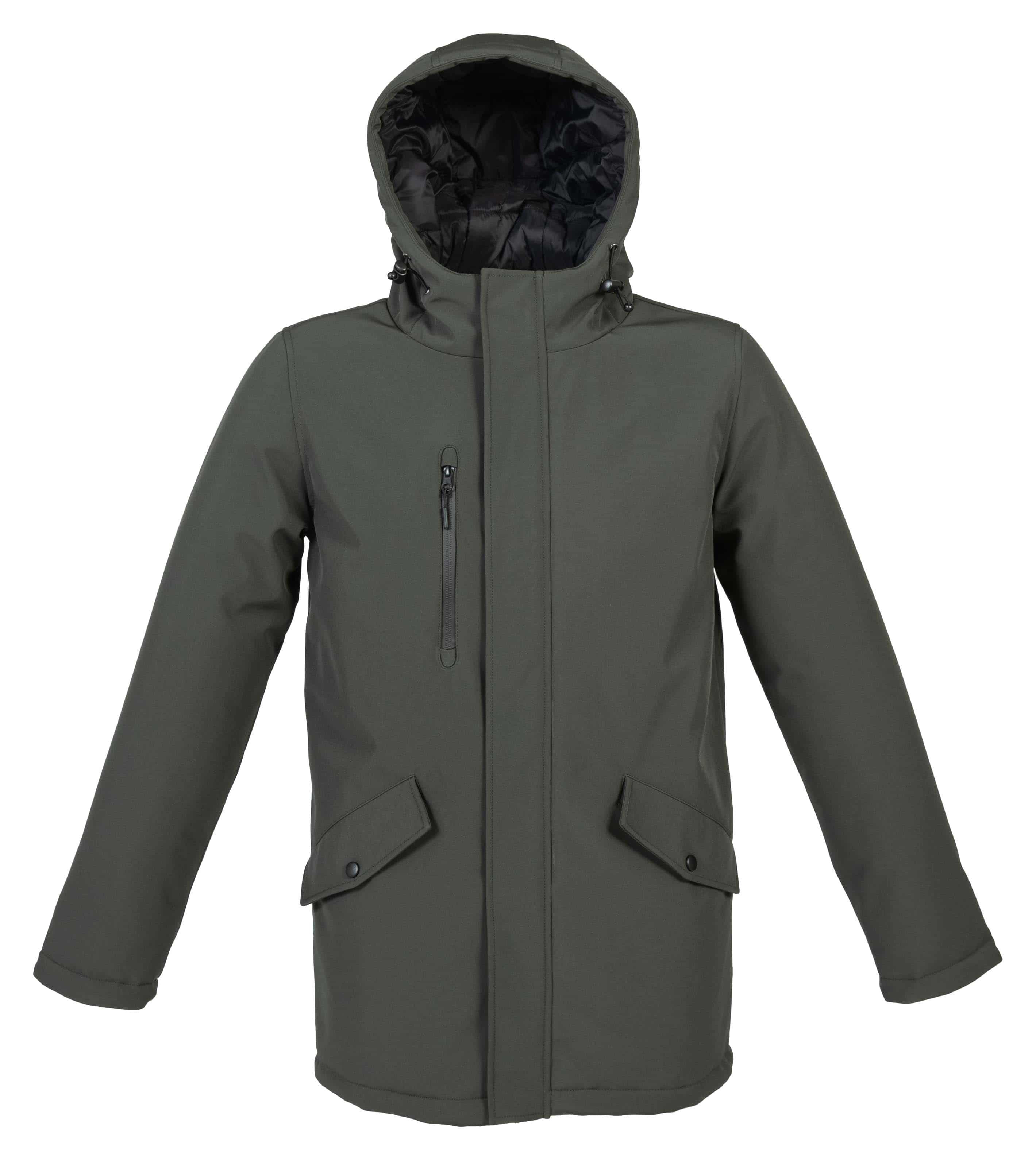 Il cappuccio è imbottito e dotato di una coulisse, mentre la zip centrale è coperta con doppio cursore. Sono presenti due ampie tasche esterne con bottoni automatici e una tasca sul petto con cerniera antiacqua con taglio laser.