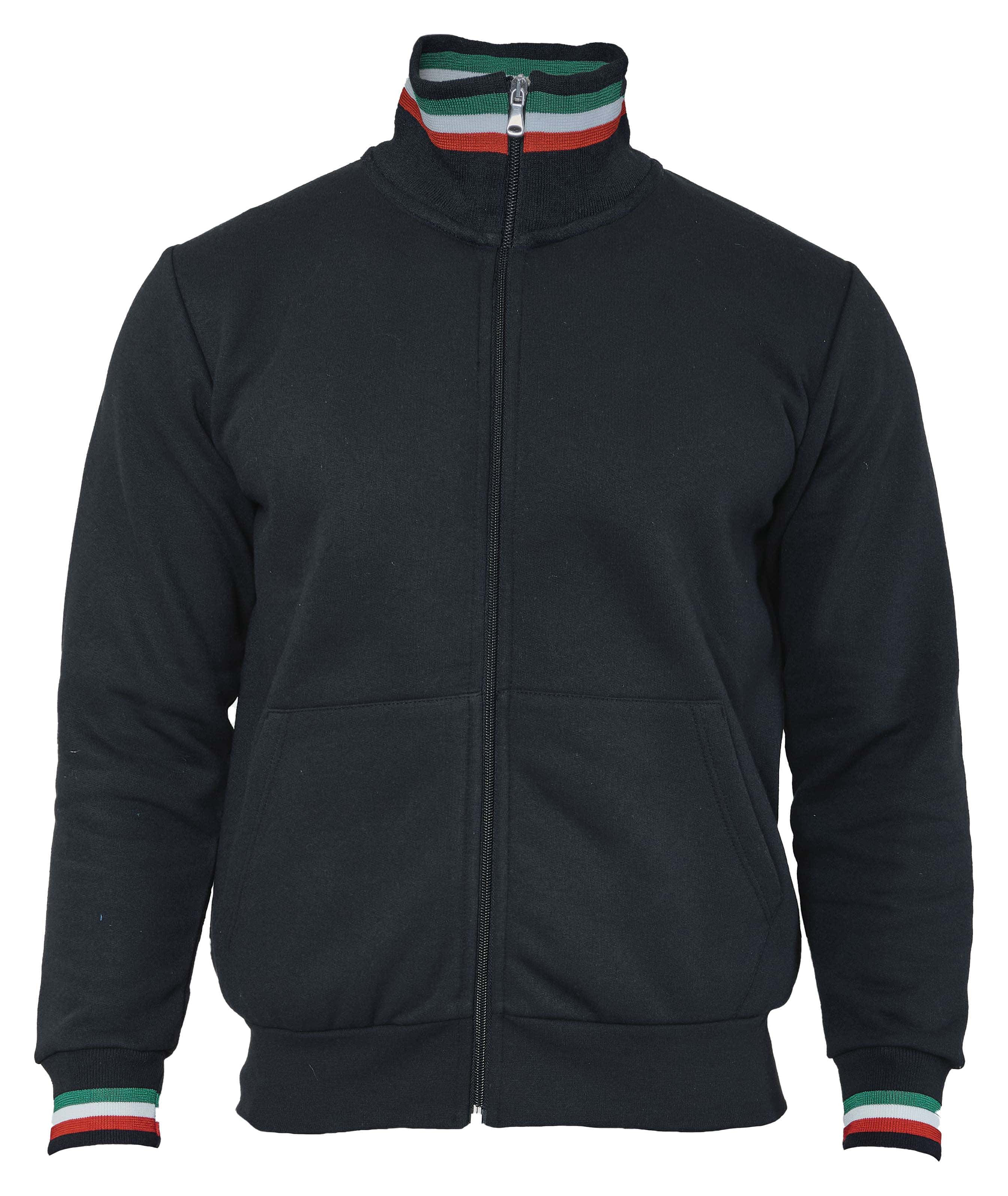 FELPA MADE IN ITALY ECOLOGICA - Composizione: 50% cotone riciclato 50% poliestere riciclato - Zip lunga - Tricolore interno ed esterno collo e sui polsini - Collo a lupetto - Nastro di rinforzo interno collo - Due tasche a marsupio - Collo, polsini e fondo maglia in costina elasticizzata - Non imbustata